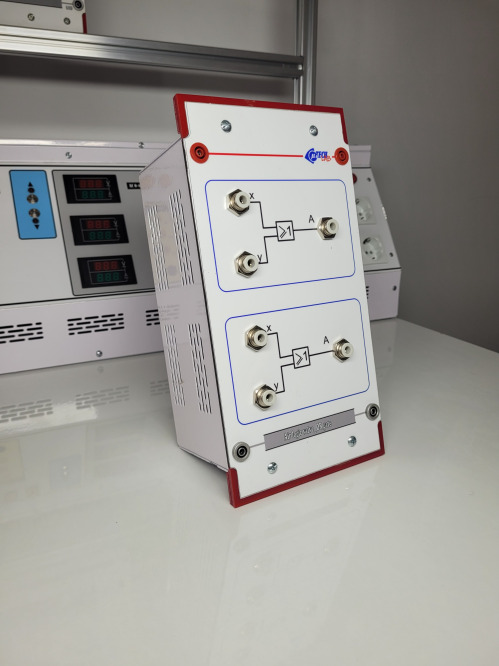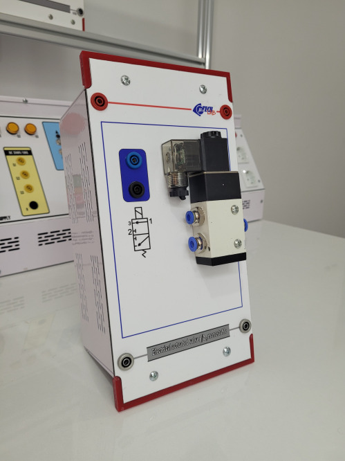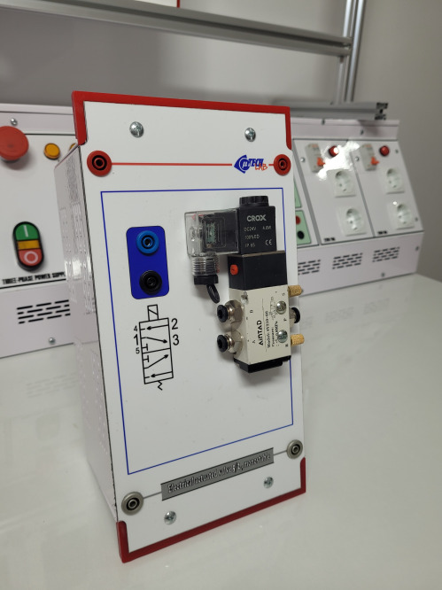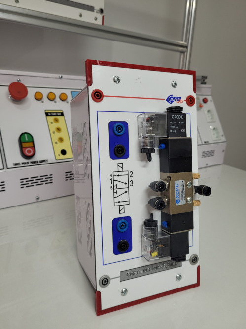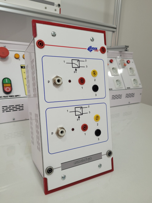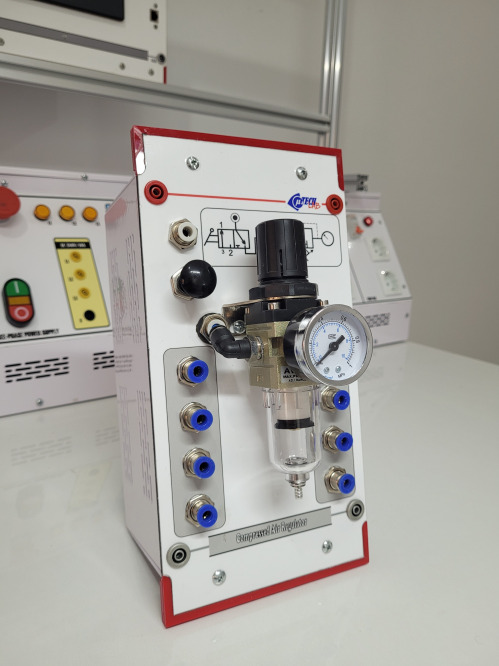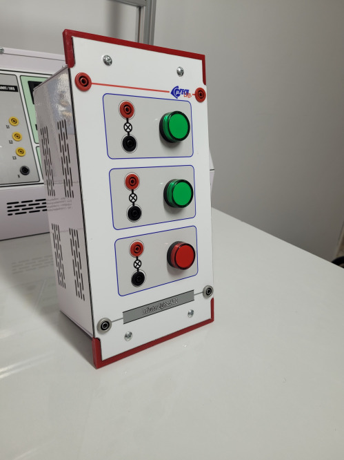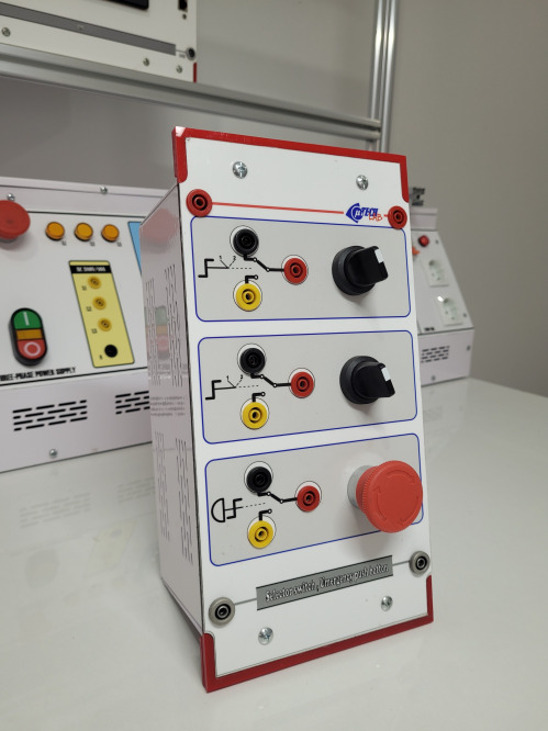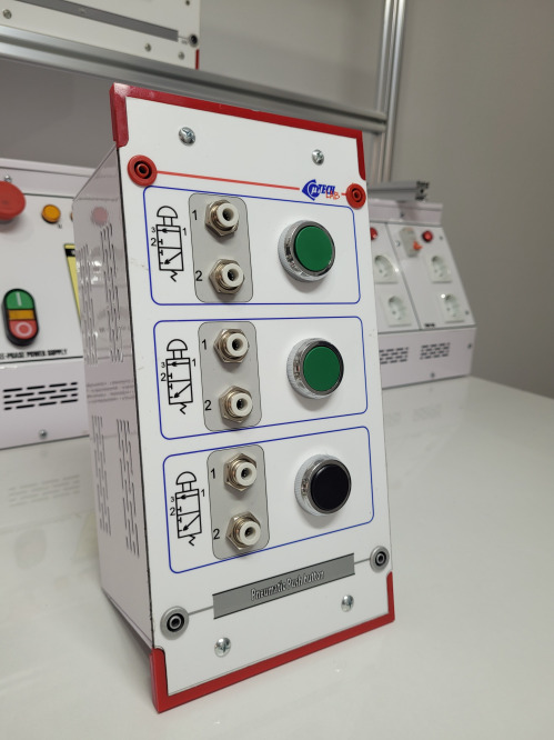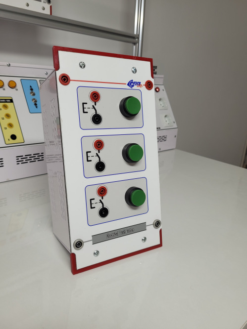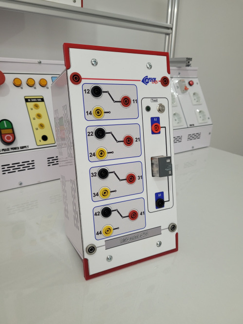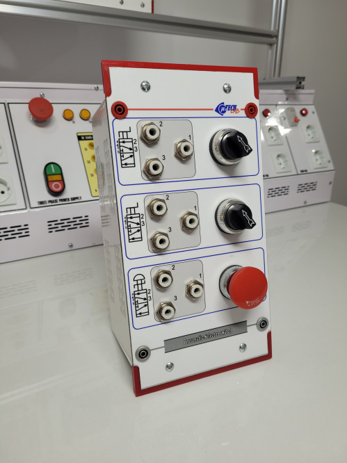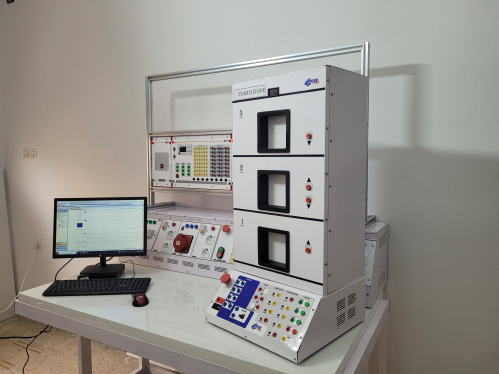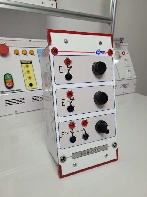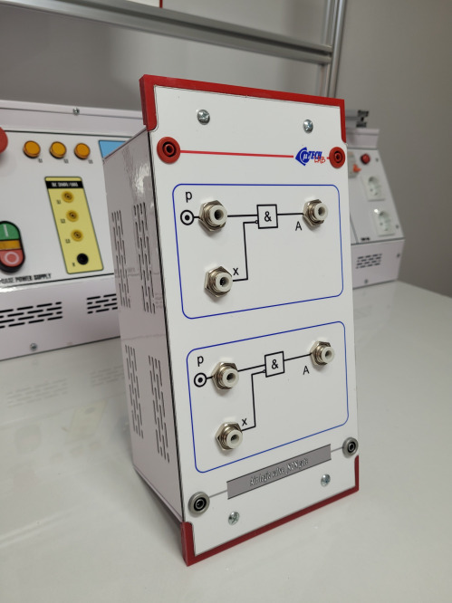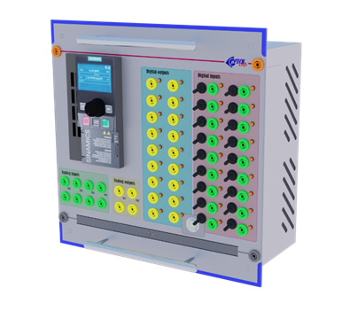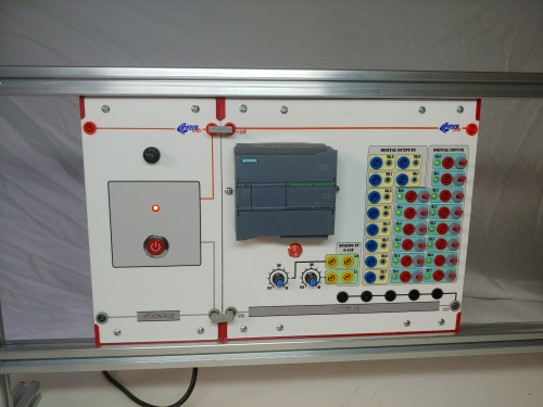 Le panneau didactique comporte à la basse une automate programmable S7-1200, où toutes les entrées/sorties (analogique ou numérique) sont connectées à l'extérieur par des borniers fiche banane 4mm avec des interrupteurs et des témoins lumineux.