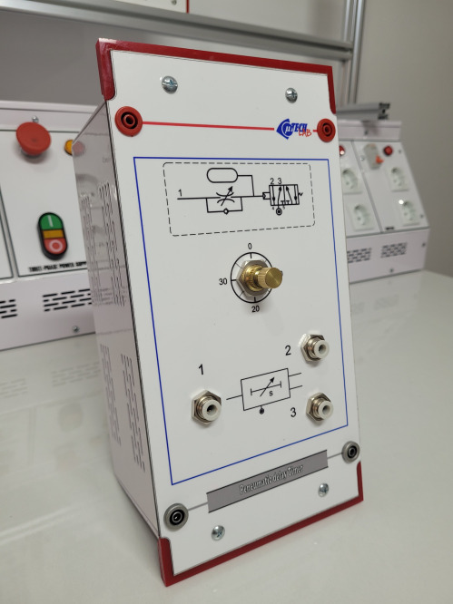 Le module temporisateur pneumatique est dispositif pneumatique qui agit de manière similaire à son homologue en électronique qui introduit un retard temporel dans la transmission de la pression de sortie par rapport aux pressions d'entrée. Contrairement aux autres portes logiques qui produisent une sortie immédiatement en fonction des entrées actuelles, cette porte logique retarde la production de la sortie pendant une certaine période après que les conditions d'entrée sont remplies.
