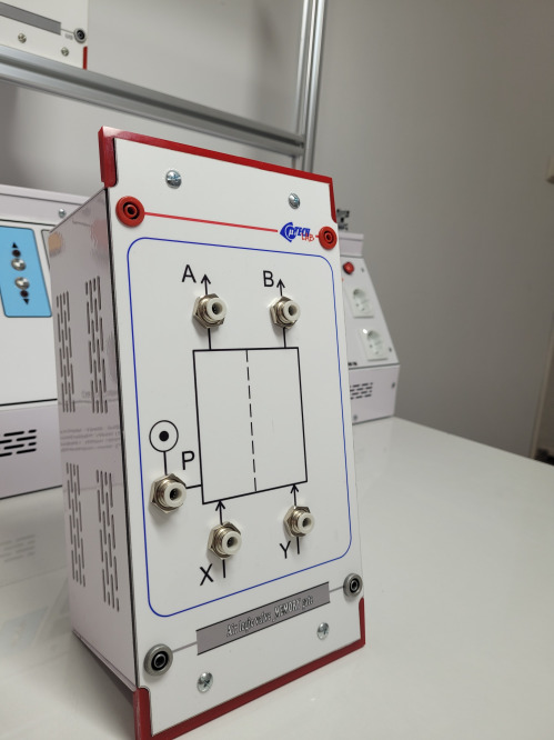 Le module de porte logique mémoire est dispositif pneumatique qui agit de manière similaire à son homologue en électronique, il maintient en mémoire un état binaire, représenté par une seule donnée (0 ou 1). Contrairement aux autres modules de portes logiques qui génère une sortie en fonction des entrées actuelles, en branchant la commande et une des entrées avec une source de pression, le module va diffuser le flux de pression vers la sortie relier avec l’entrée sous branchement même en débranchant l’entrée de pression (l’entrée X est relier avec la sortie A et l’entrée Y est relier avec la sortie B) et va conserver et restituer cet état jusqu'à ce qu'en changeant l’entrée de pression.