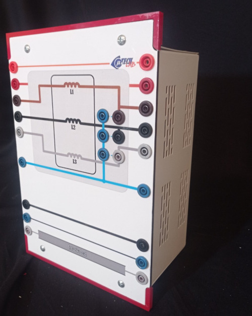 La charge inductive offerte par µTECH LAB est composée de trois inductances avec sept positions chacune. Les inductances donnent la possibilité de connexion à étoile, à triangle et en parallèle, commandées par trois interrupteurs.